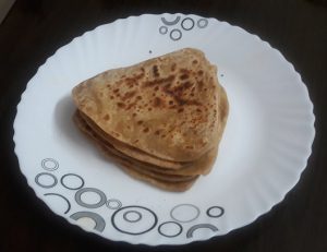 अब एक आटे की लोई बना कर उसे रोटी की तरह बेलें और उस पर चम्मच से घी लगा कर फेलाएं फिर उसे आधा मोड़ लें। इसे दुबारा मोड़ कर तिकोना शेप दें। अब इसे सूखा आटा लगाकर पतला बेलें और तवे पे घी लगा कर सेक लें।
