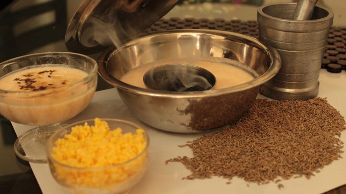 - अब जो कोयला हमने गर्म किया है उसे चिमटे की सहायता से कटोरी में रखेंगे और उस पर 2 टी स्पून घी डालेंगे जिस से धुआं आने लगेगा, तुरंत बर्तन को ढक देंगे।