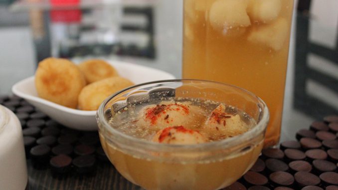 - परोसने के लिए हम एक बाउल लेंगे उस में 2/3 वडे लेंगे उस पर थोड़ी सी पिसी हुई लाल मिर्च, नमक, और पिसा भुना जीरा छिड़क कर कांजी का पानी डालेंगे और स्वाद लेंगे।
