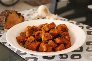 - Now peel the yam and cut it into medium sized cubes.